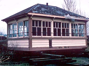 The first working party took place on Sunday 12th October 1975 after which, working parties were organised each Sunday, and some Saturdays as well. Four members, more crazy than the rest spent a cold damp night of November 5, drilling a series of holes for bolts and screws to secure strengthening brackets for the four corners of the structure, by the light of a Tilley lamp. During these working weekends, the locking frame was bolted to its supporting wooden beams with coach screws. The inner and outer leading-off beds were disconnected and removed. All the point and gate rodding, together with the cranks, the box steps and the level crossing gates were recovered, and a telegraph pole removed. The inside of the structure was reinforced with scaffolding, and the guttering and bottom row of slates removed and other slates made secure. The vent on the roof was also removed, as the overall height had to be less than 14 ft to travel without a special movement order.